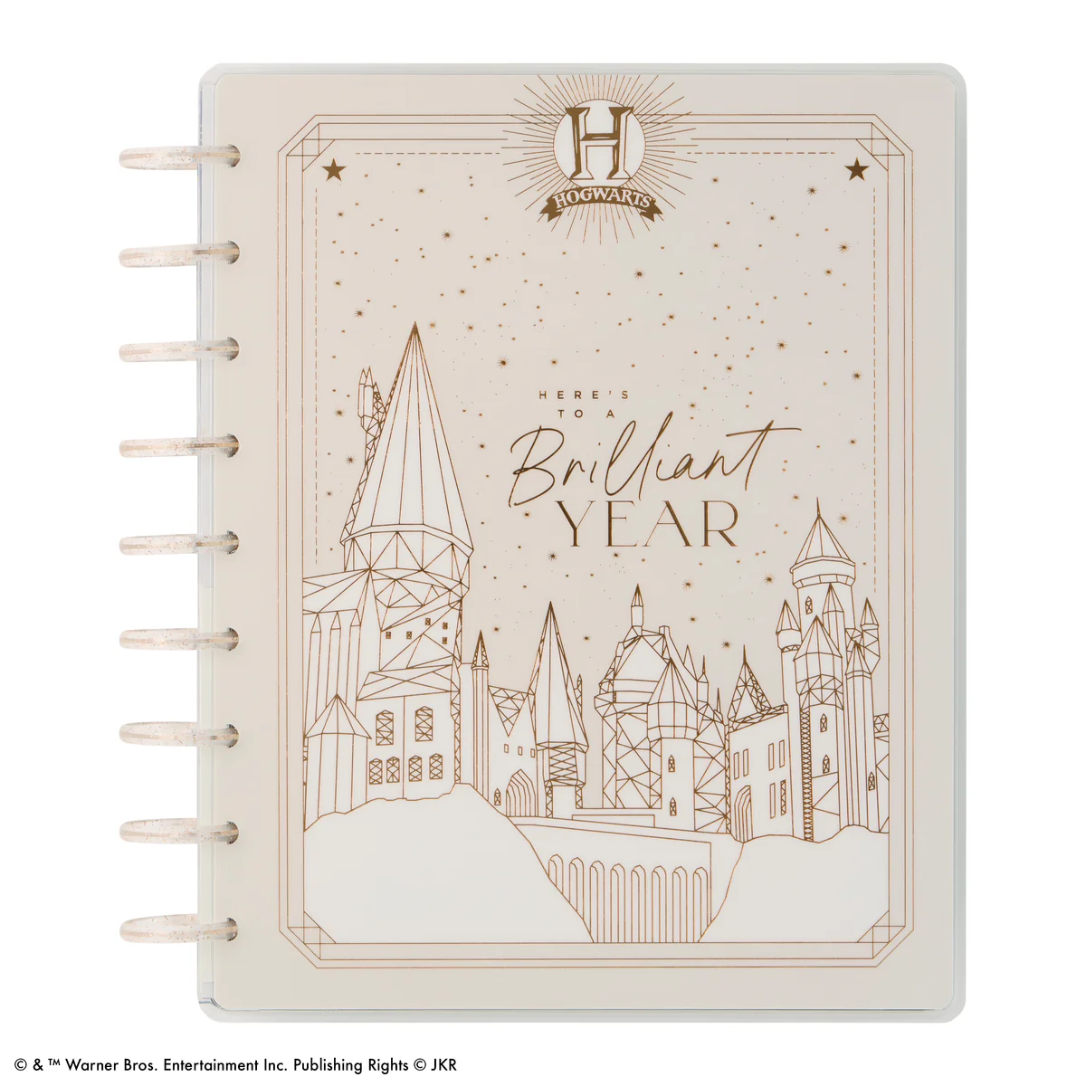 Plan for your next potions class or a trip to Hogsmeade with this Harry Potter Big Happy Planner with our vertical layout. Use the included sticker sheet to label each divider with designs inspired by the four Hogwarts™ Houses. The foil accents add a hint of wonder to your organizational process. The cover is designed with a picture of Hogwarts™ and offset by rose gold glitter plastic discs. Another year of wonder awaits!